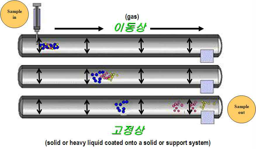 시료 중의 성분이 고정상과 그 사이를 통과해서 흐르는 이동상의 서로 다른 비율로 분배되면 성분마다 고정상을 이동하는 속도에 차이가 생겨 분리된다.
